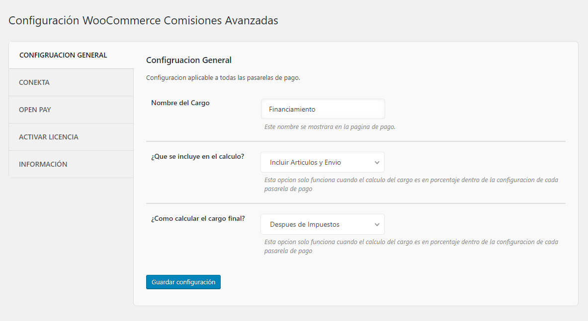 Con WooCommerce Comisiones Avanzadas puedes generar cargos adicionales a tus clientes cuando seleccionen una pasarela de pago en específico al momento de finalizar su compra y en caso de que uses Conekta u Open Pay en tu tienda en línea, tienes la posibilidad de generar cargos extras por porcentaje o monto fijo cuanto el usuario selecciona pagar a meses sin intereses. Las opciones son totalmente personalizables, es decir, puedes generar una comisión diferente para cada plazo de pago para cada pasarela.
