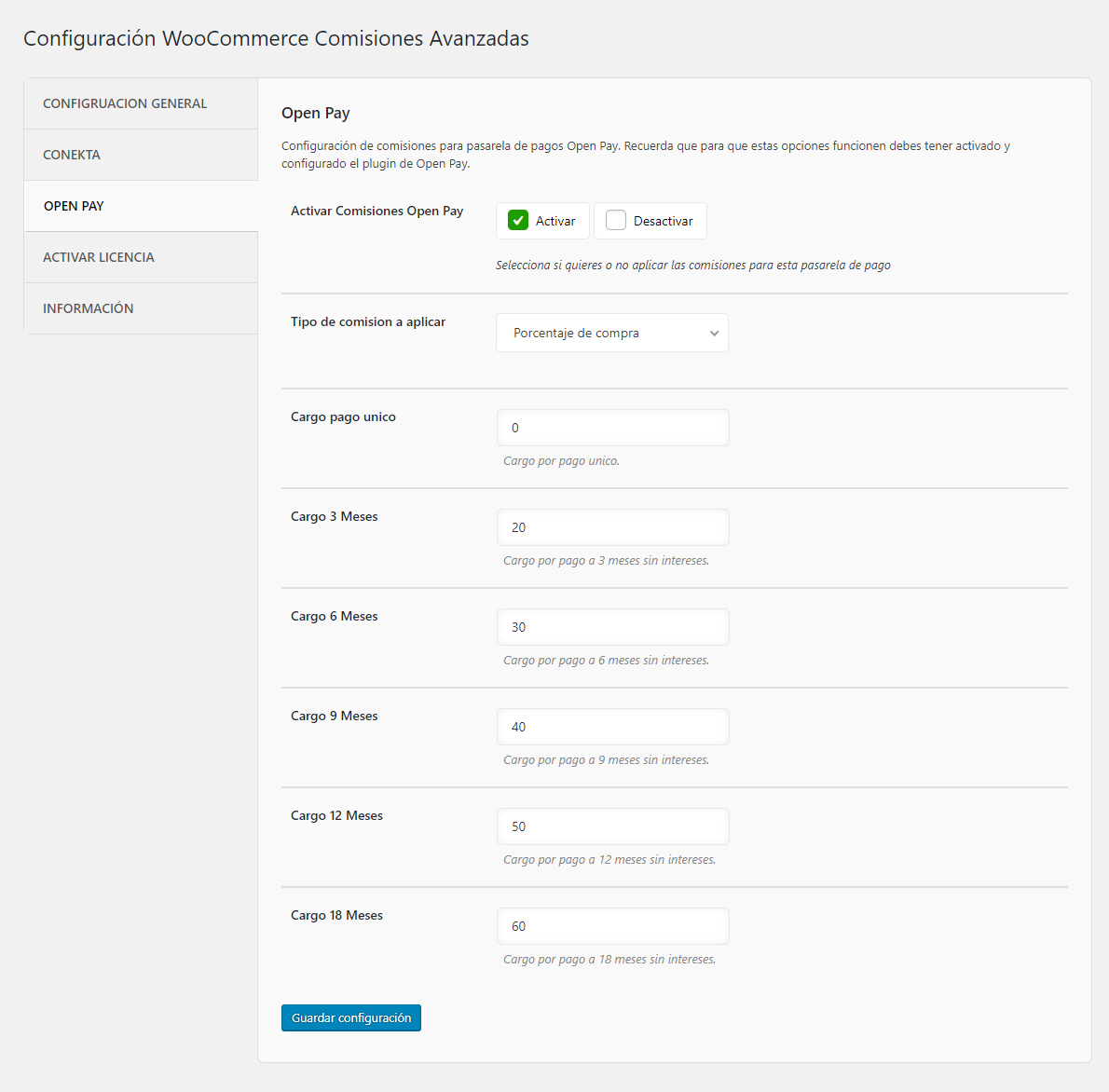Para la pasarela de pago OpenPay las opciones de configuración son las mismas que las de Conekta, la única diferencia es que OpenPay tiene la opción de pagar a 18 MSI y puedes configurar el cargo adicional para este plazo en específico.